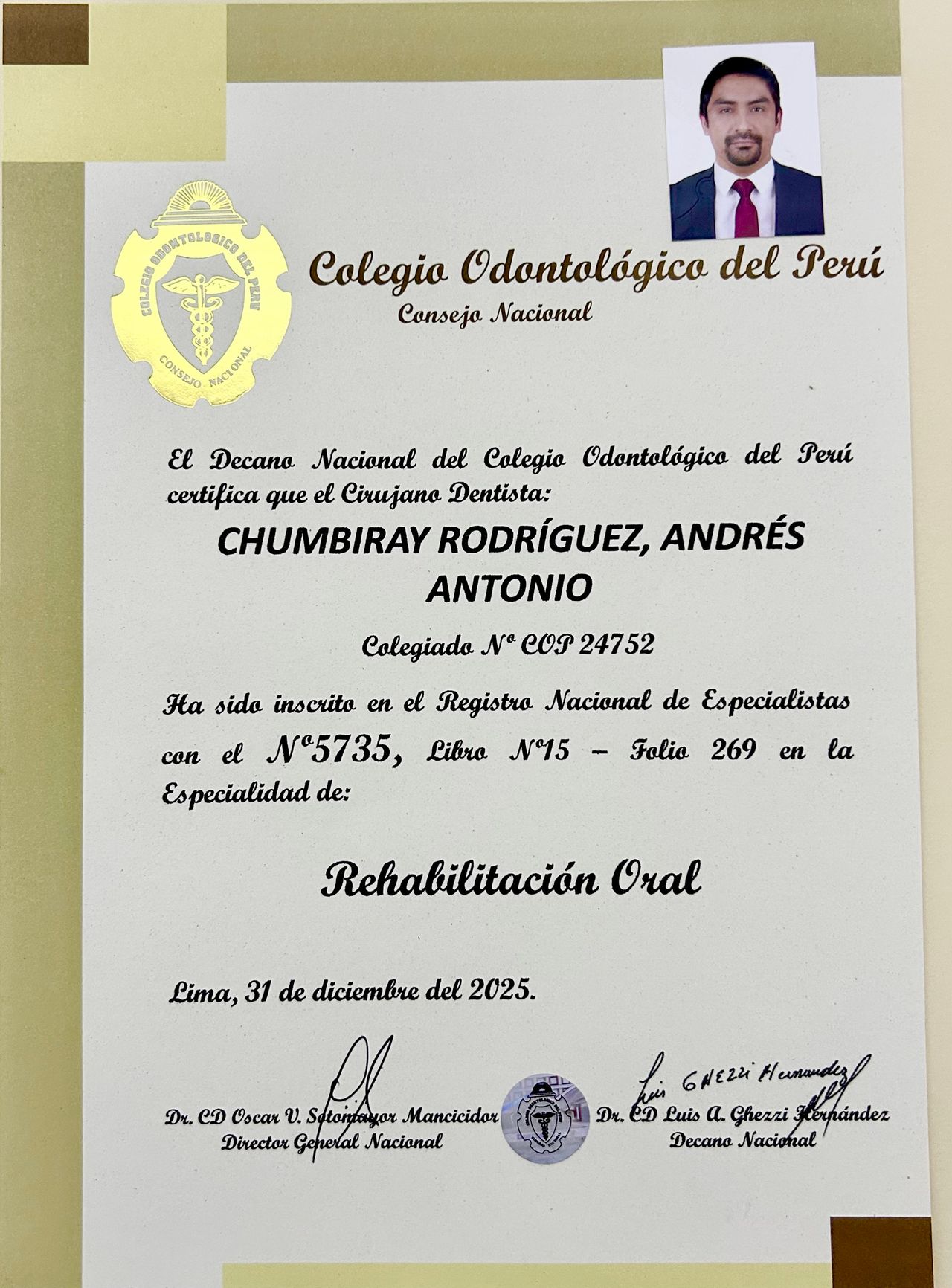 ¡Hola! Soy el Dr. Andrés Chumbiray, odontólogo especialista en Rehabilitación Oral y Estética Dental (con número de registro de especialista RNE 5735) con más de 15 años de experiencia, formado en Perú y Brasil. Mi objetivo es ayudarte a recuperar la salud y estética de tu sonrisa con tratamientos personalizados, tecnología de última generación y materiales de alta calidad.