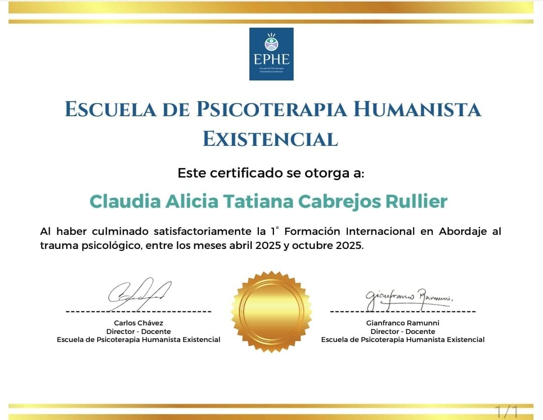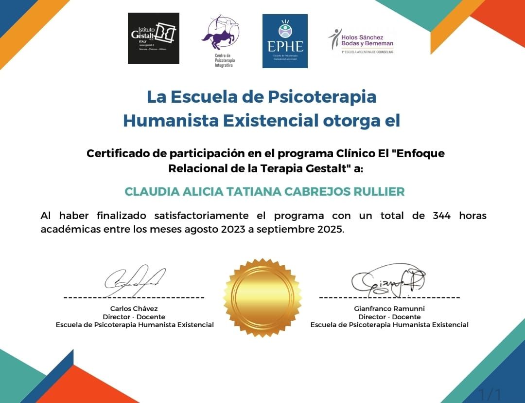 Psicóloga Licenciada y colegiada con certificación en Psicoterapia Humanista - Gestalt y Terapeuta de Pareja. Cuento con amplia experiencia trabajando con adultos y adolescentes con trastornos del estado del animo y duelo. Mi propósito como psicoterapeuta es ayudarte a encontrar respuestas a lo que te sucede y darte las herramientas psicológicas necesarias para la situación que te encuentres atravesando.