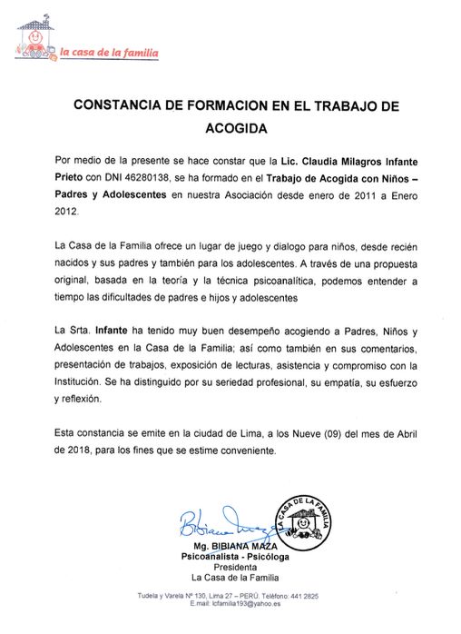 Nos ayudo muchísimo a encontrar las causas del problema y buscar soluciones efectivas para la mejora de nuestra crianza con nuestros 2 pequeños. La recomiendo completamente.• Consultorio virtual (en línea) • Consulta online •