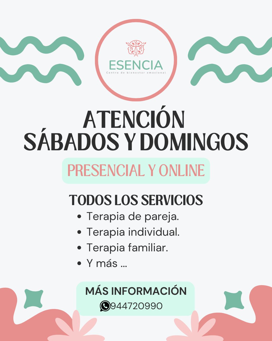 Disfruto cada día de mi pasión de ser Psicóloga, mi propósito de vida y mi ocupación coincidieron mágicamente. Vivo apasionada de acompañar a las personas a su propio encuentro, al contacto con su ser y su poder interior, con su propio proceso de crecimiento y desarrollo personal a través de técnicas y herramientas propias de la psicoterapia y la psicología. Durante mis más de 14 años de experiencia profesional he logrado expandirme y formar mi Centro de Bienestar Emocional ESENCIA con un equipo de trabajo maravilloso conformado por 10 hermosos/as psicologos/as que ofrecen Atenciones Psicológicas Virtuales y Presenciales en ya 9 sedes en Lima Perú : San Borja, Surco, San Isidro, Pueblo Libre, Magdalena, San Miguel, Jesús María, Los Olivos y Miraflores. Cada uno de ellos tiene mi confianza por su gran capacidad humana y talento profesional. Si en caso no coincidimos tú y yo en horarios o sedes, te puedo recomendar con mucho cariño a mi maravilloso equipo de trabajo, que han sido seleccionados de manera muy estricta y exhaustiva y cuentan con toda mi confianza por las muy buenas recomendaciones que he recibo de su trabajo terapeutico, su profesionalismo y dedicación. Te invito a mantenernos en contacto mediante las redes sociales y asi puedas acceder a un gran contenido que será de mucha ayuda en tu camino a crecer emocionalmente Un abrazo enorme Dale «seguir» para que no te pierdas de todo el material GRATUITO - Colegiatura habilitada N°19476. - Psicoterapeuta Cognitivo Conductual afiliado al Albert Institute de Nueva York - Psicoterapeuta Gestáltica del Instituto Gestalt de Lima - Maestría en Psicología Clínica por la Universidad Peruano Cayetano Heredia - Especialización en Terapia Cognitivo Conductual para la Ansiedad en el Beck Institute de Nueva York - Estados Unidos - Especialización en Terapia Cognitivo Conductual en niños y adolescentes en Psicotrec, Centro de Terapia Racional Emotiva y Cognitiva Conductual acreditado por la International Association on Rational Emotive Behavior Therapy. - Especialización en Violencia de Género e integrantes del grupo familiar. - Formación Psicoterapéutica en el Método Gottman en Terapia de Pareja en The Gottman Institute, Clinical Foundations in Gottman Method Couples Therapy. Estados Unidos. - Más de 14 años de experiencia en el campo de la Psicología Clínica, con niños, adolescentes y adultos con problemas emocionales y conductuales, en Terapia Individual, de Pareja y Familia. - Estudios realizados en Perú y Estados Unidos. - Catedrática de la Universidad Nacional Mayor de San Marcos y Universidad de San Martin de Porres Servicios: Terapia de Pareja Terapia Psicológica Adultos – Adolescentes Terapia Cognitivo Conductual Psicoterapia Entrenamiento para Padres Orientación Vocacional Psicología de adultos Psicoterapia Gestalt Terapia Familiar Psicoterapia para adolescentes Terapia para adultos