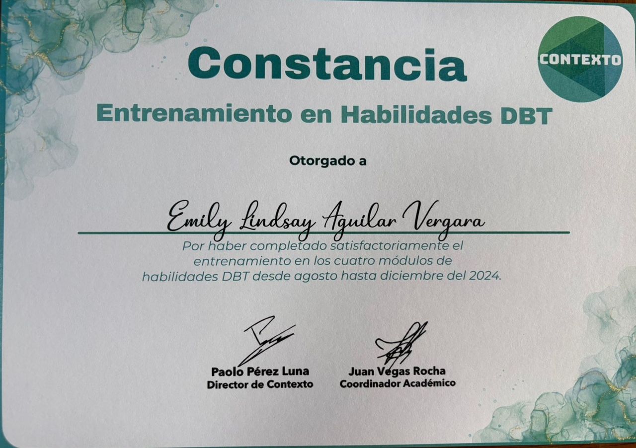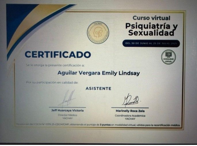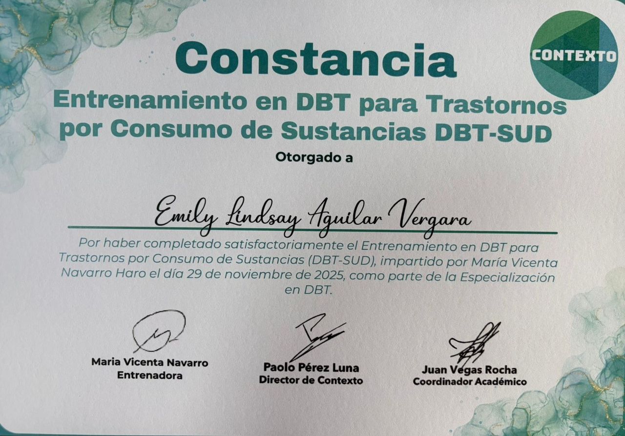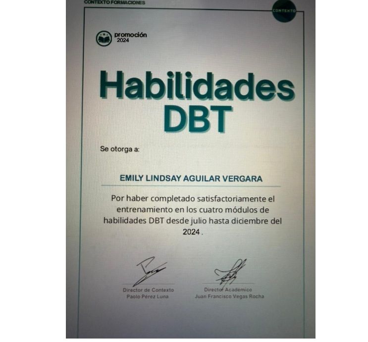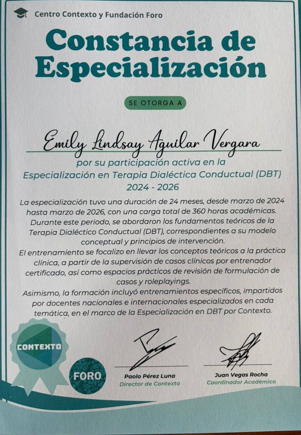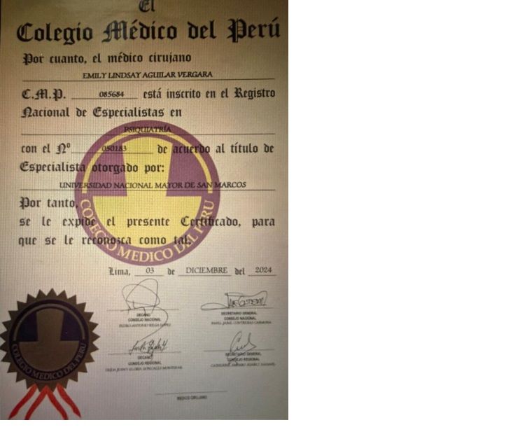 Formada en la Universidad Nacional Mayor de San Marcos (Pregrado en Medicina Humana y Postgrado en Psiquiatría), para el tratamiento de depresión, ansiedad, trastorno límite de la personalidad (TLP), desregulación emocional y traumas, entre otras condiciones.