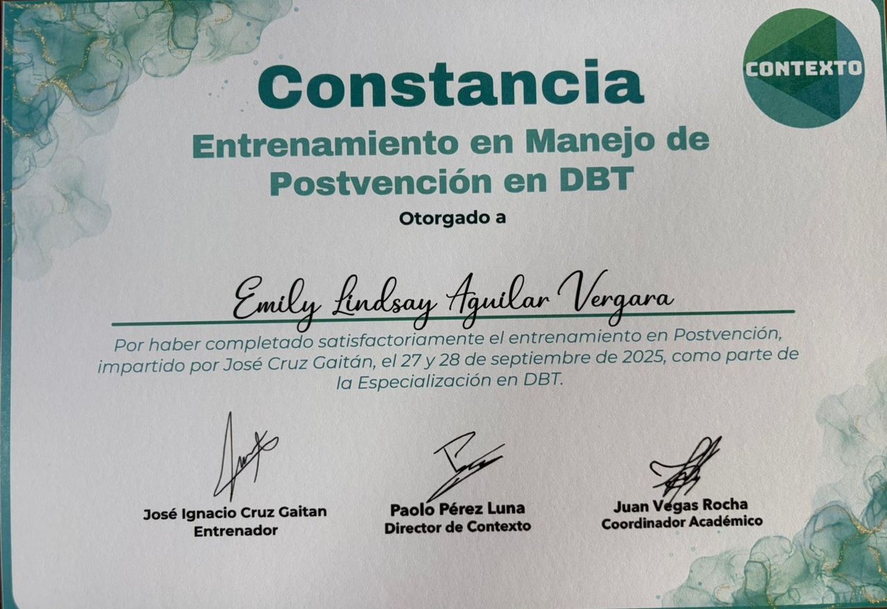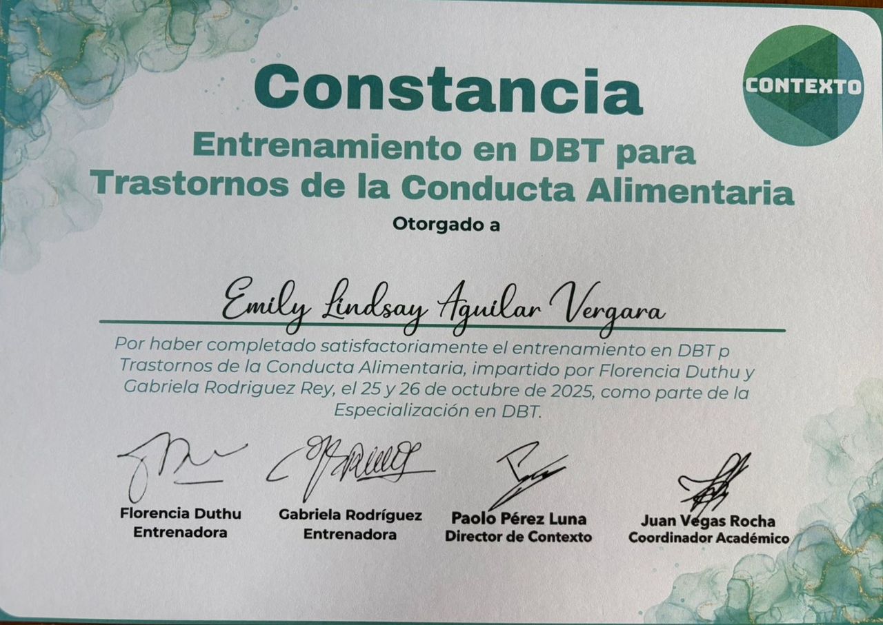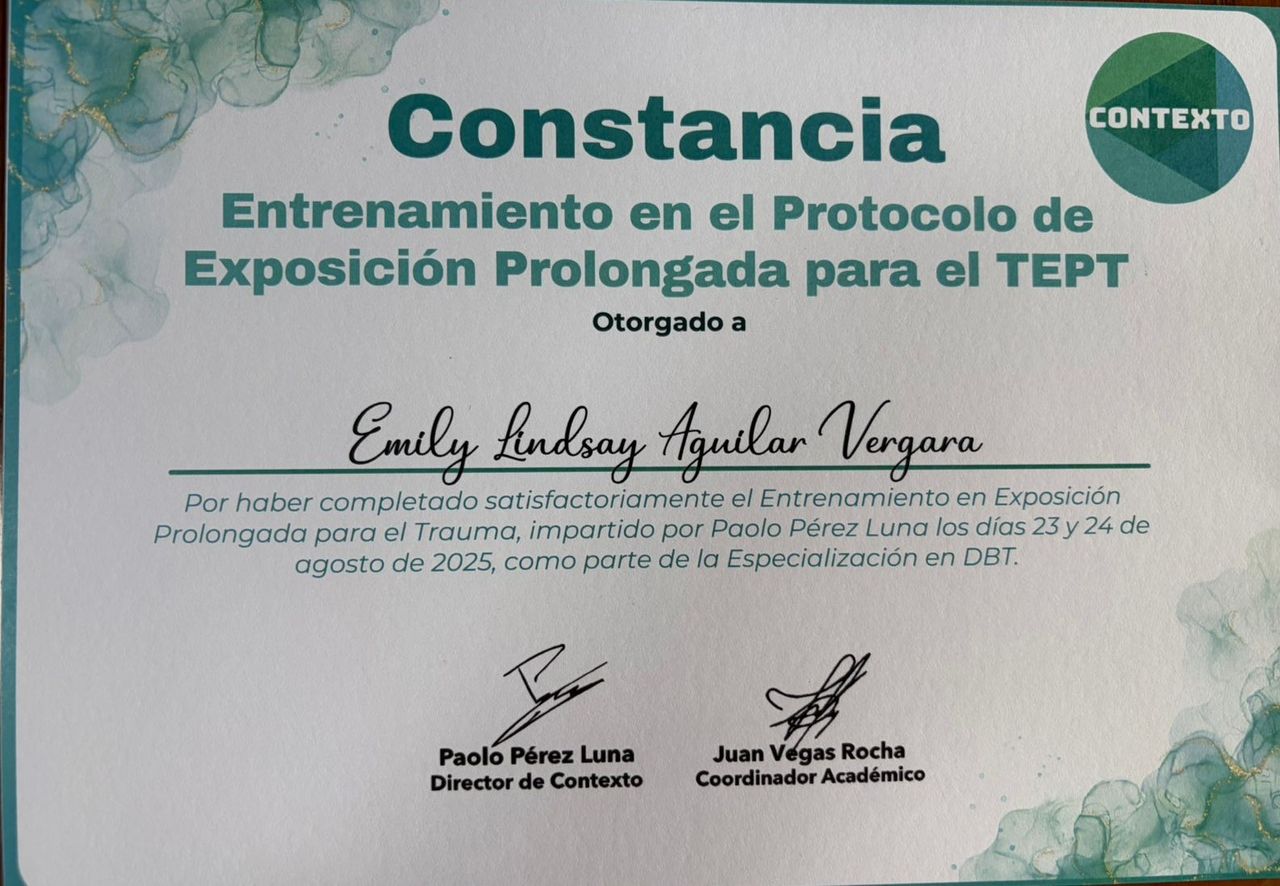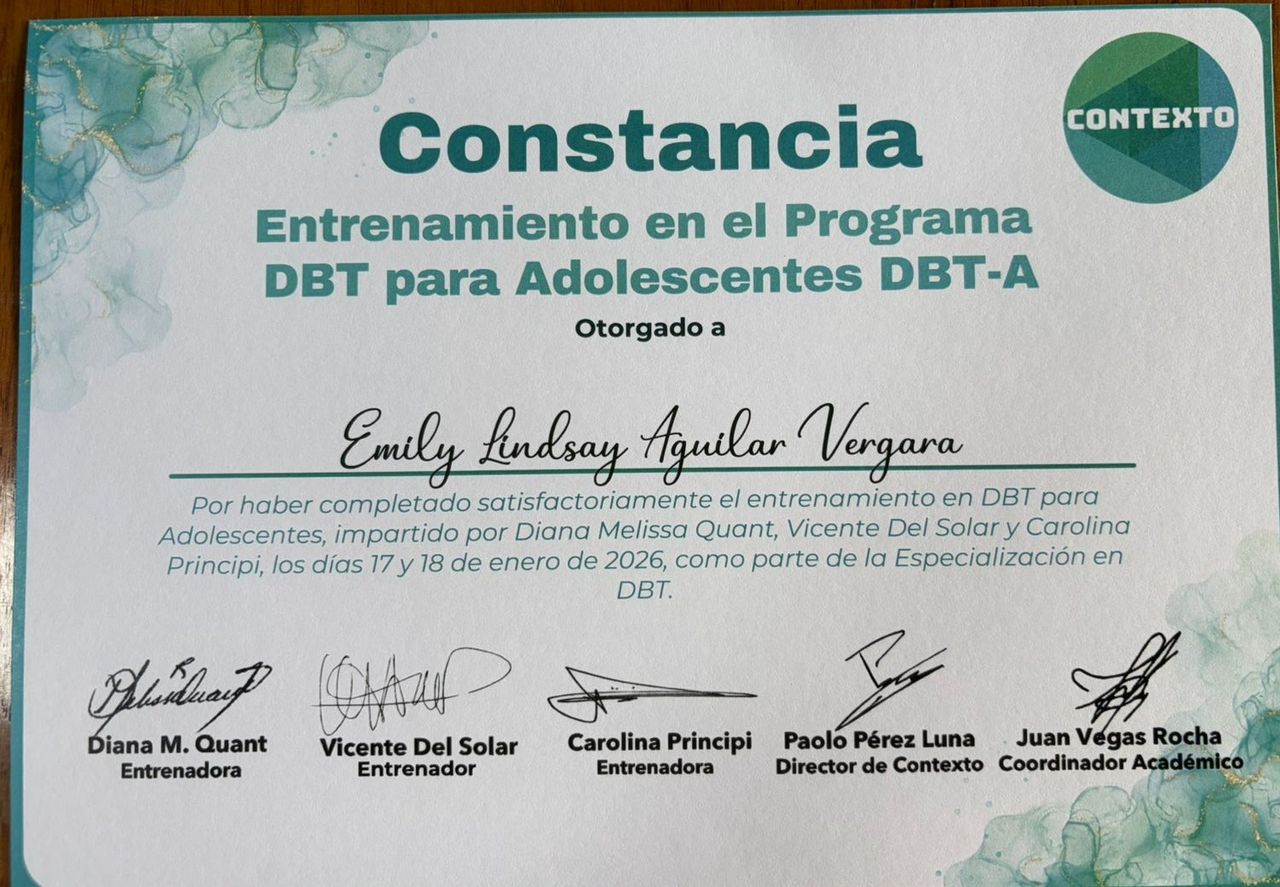 Formada en la Universidad Nacional Mayor de San Marcos (Pregrado en Medicina Humana y Postgrado en Psiquiatría), para el tratamiento de depresión, ansiedad, trastorno límite de la personalidad (TLP), desregulación emocional y traumas, entre otras condiciones.