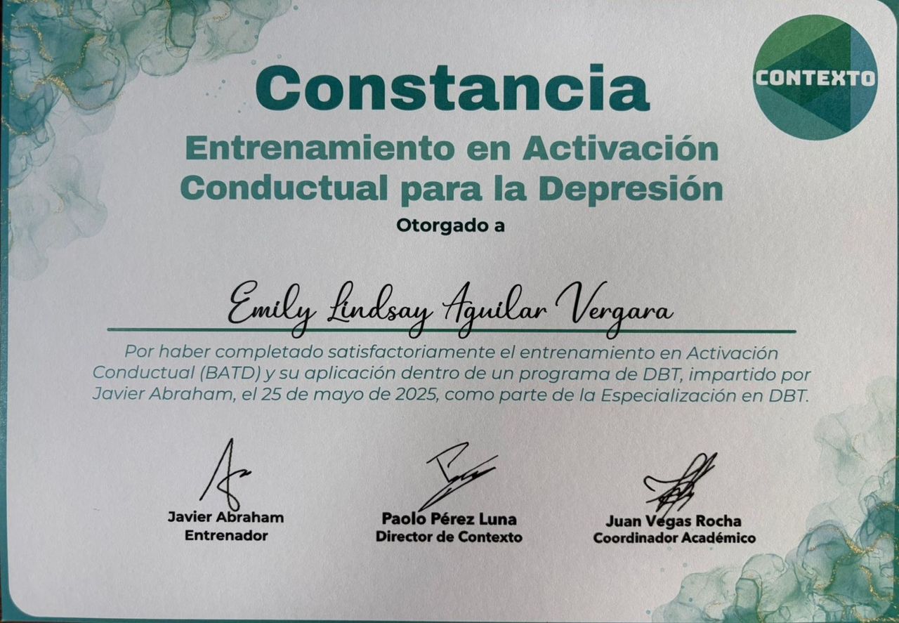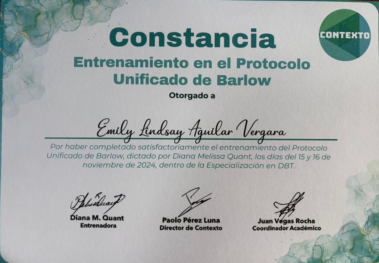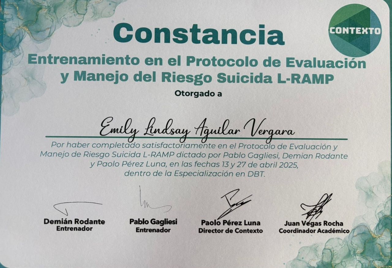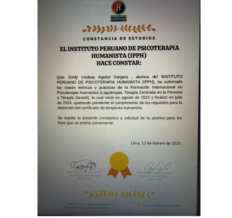 Formada en la Universidad Nacional Mayor de San Marcos (Pregrado en Medicina Humana y Postgrado en Psiquiatría), para el tratamiento de depresión, ansiedad, trastorno límite de la personalidad (TLP), desregulación emocional y traumas, entre otras condiciones.
