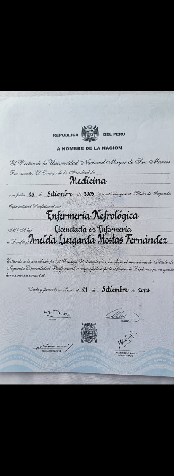 Soy enfermera especialista en diálisis y enfermedad renal crónica, con amplia experiencia en el cuidado de pacientes que requieren tratamientos sustitutivos renales como la Hemodiálisis ,diálisis Peritoneal y Trasplante renal. Asi como la prevención enfermedades renales