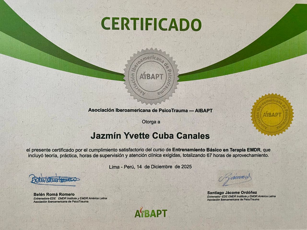 Soy psicóloga con 7 años de práctica clínia y cuento con formación certificada en la Terapia EMDR. Asimismo, formo parte de la Asociación EMDR Perú, lo que garantiza que mi práctica se rige por los estándares y protocolos oficiales de esta metodología, la cual es altamente efectiva para procesar memorias traumáticas de forma profunda y segura.