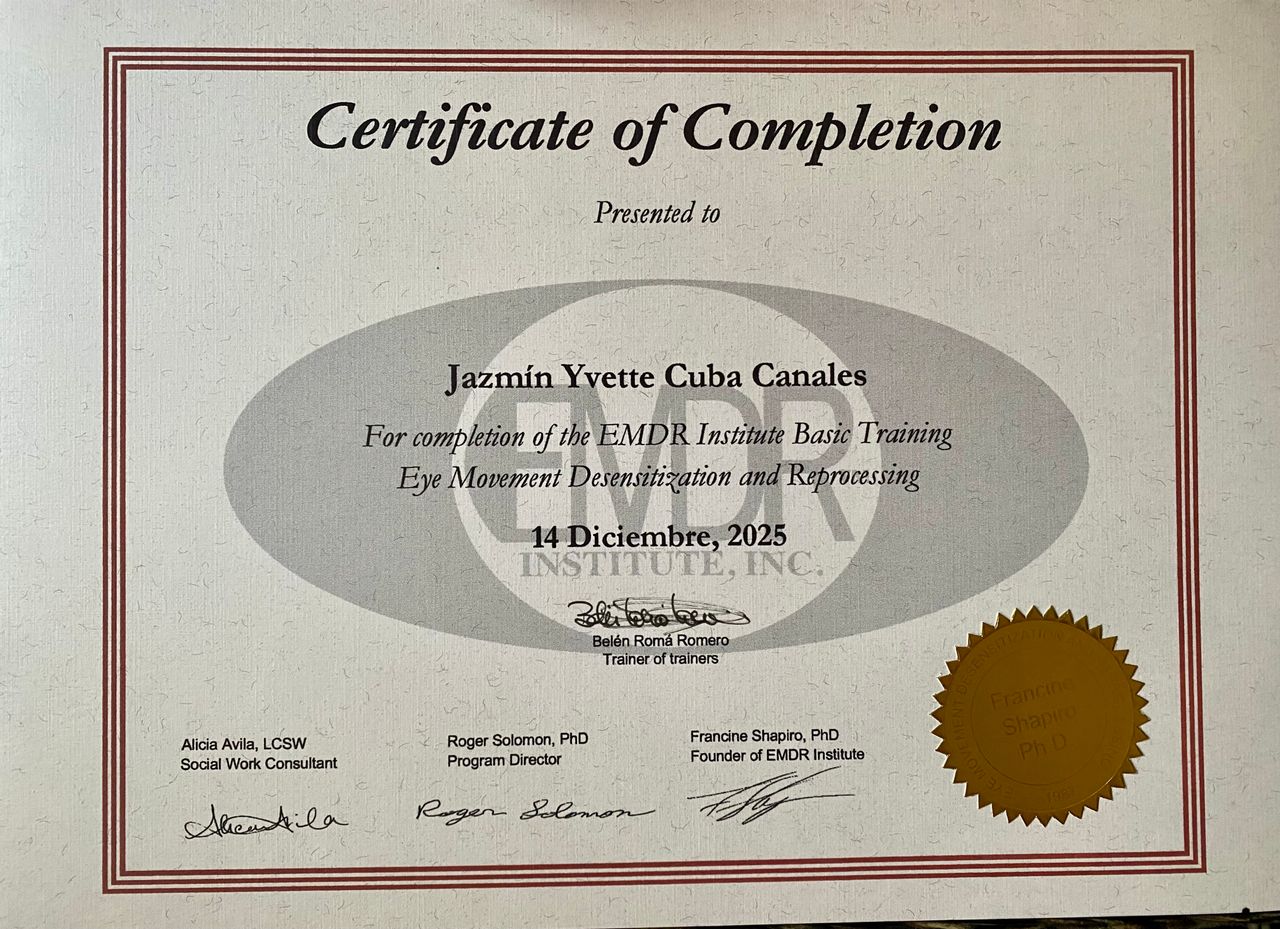 Cuento con formación certificada en Terapia EMDR (Desensibilización y Reprocesamiento por Movimientos Oculares), avalada por el EMDR Institute y la Asociación Iberoamericana de PsicoTrauma. Este enfoque basado en evidencia me permite trabajar de manera profunda y gentil con cada uno de mis pacientes.