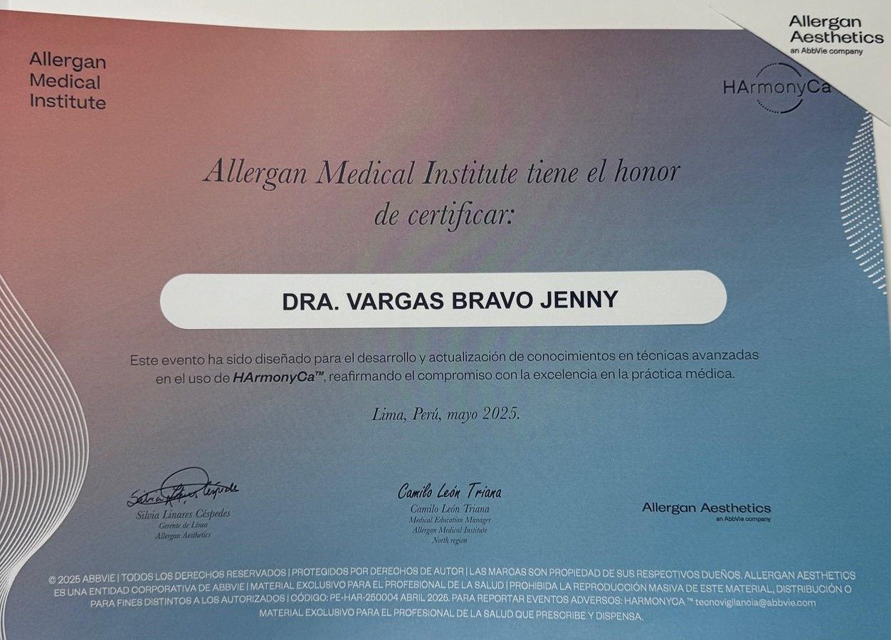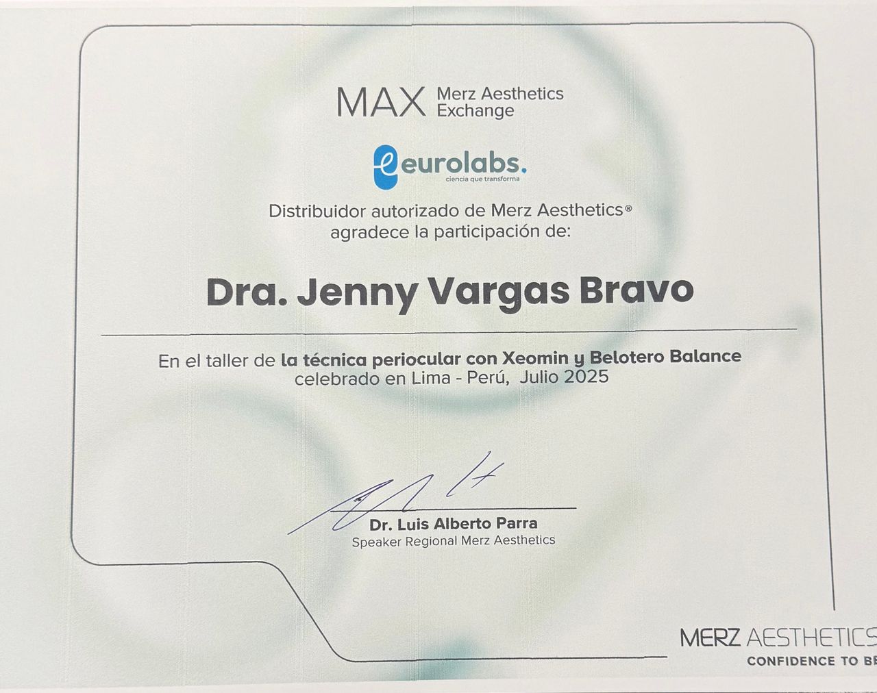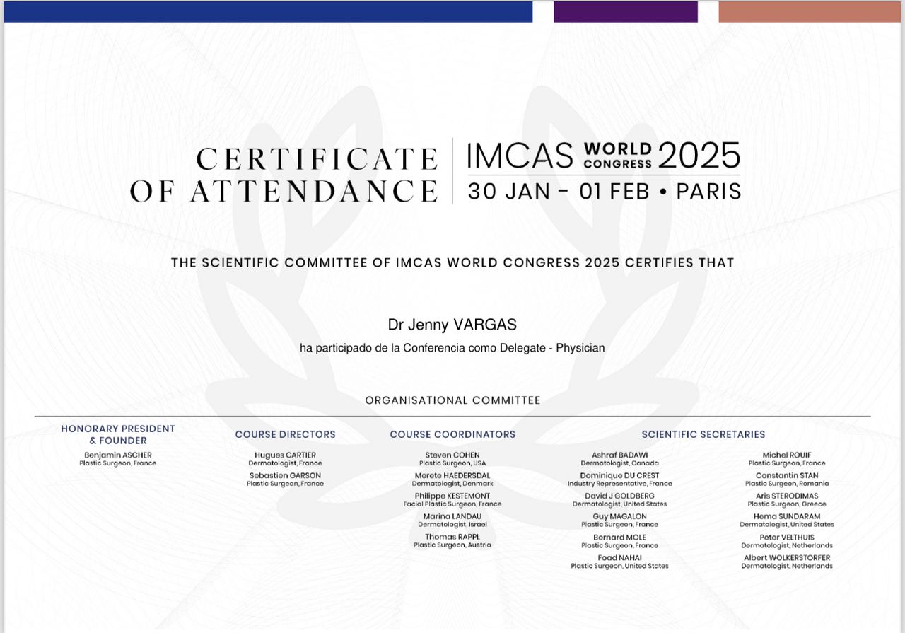 Soy la Dra. Jenny Vargas Bravo Especialista en Dermatología clínica, quirúrgica y estética (CUBA) Máster en Medicina Estética, Regenerativa y antienvejecimiento (ESPAÑA). Especialista también en Medicina General Integral con más de 10 años de experiencia aquí les narro un poco de mi trayectoria de formación Fui becada por rendimiento académico para estudiar en la Escuela Latinoamericana de Medicina en Cuba (ELAM) graduándome de médico cirujana luego hice la especialidad de Medicina General integral para poder realizar mi segunda especialidad de Dermatología clínica quirúrgica y estética en la universidad Celia Sánchez Manduley -Cuba, me gradué con un promedio de sobresaliente realice como residente mi diplomatura de dermatología pediátrica , viajé a Argentina para adquirir conocimiento en técnicas de inyectables en estética posteriormente viajé a Brasil a la universidade Federal ABC -Sao Paulo a hacer una rotación hospitalaria donde adquirí conocimiento quirúrgico y también estético viajé a la ciudad de México para capacitarme en la aplicación del Láser, realicé también el curso de Máster Inyector Academi en Sao Paulo - Brasil donde perfeccioné técnicas modernas de la aplicación de inyectables en la práctica estética,realicé mi diplomado de dermatología clínica para actualizar los tratamientos que cada día van surgiendo nuevos aportes,realizé mi diplomado en tecnología láser porque considero que el laser ha venido a revolucionar en muchos aspectos de la medicina y nos ayudan grandemente en muchas afecciones dermatológicas, culminé mi Máster en Medicina Éstetica, Regenerativa y Antienvejecimiento en la Univesidad Complutense de Madrid obteniendo mi título universitario en una de las universidades más prestigiosas del mundo. Actualmente me encuentro realizando más cursos, considero que la medicina nos conlleva a un estudio y capacitación continua para brindar un diagnóstico y tratamiento adecuado a mis pacientes y verlos de manera integral. Me gusta mi profesión por ello le dedico gran parte de mi tiempo con la única recompensa de poder ayudar a mis pacientes. Quiero aprobechar para agradecer a mis pacientes por sus comentarios dejados en mi página, son ellos que me impulsan a seguir creciendo.