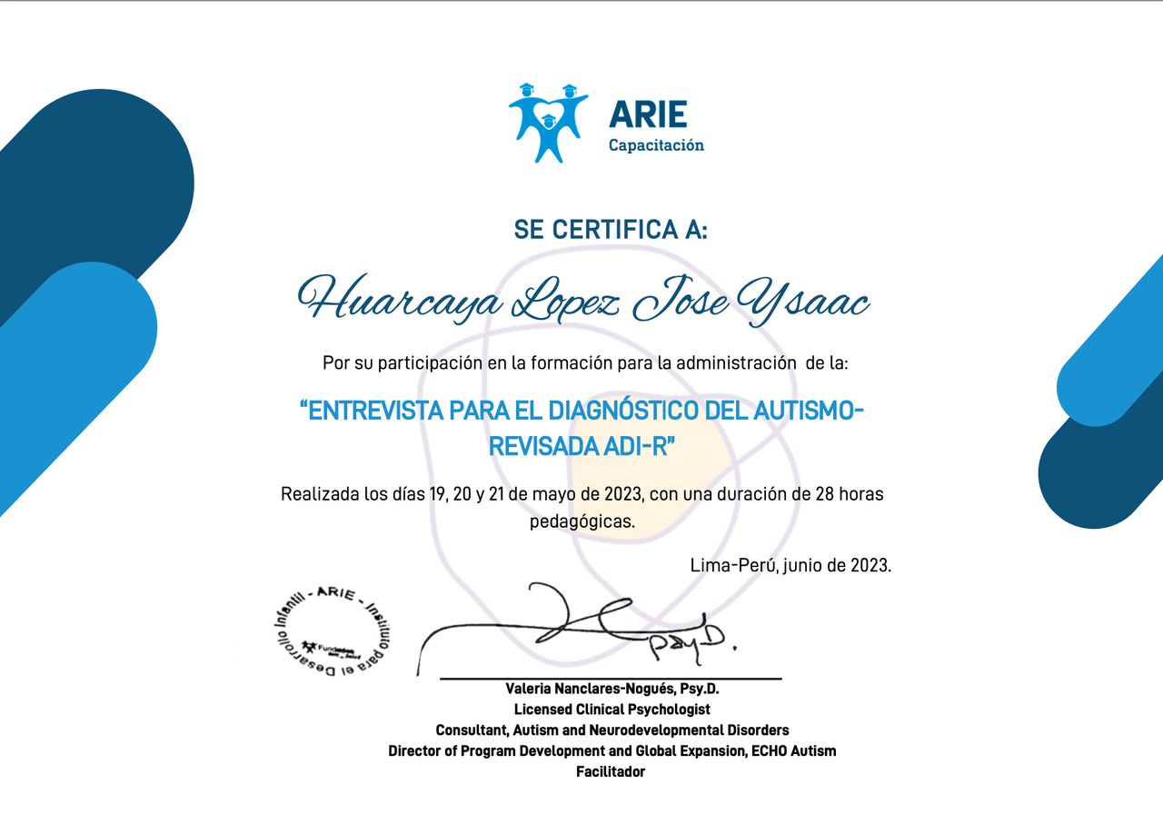 Formado y certificado en entrevista diagnóstica ADI-R, su trabajo se caracteriza por la precisión clínica, la sensibilidad humana y el compromiso con el bienestar integral de cada niño y su familia.
