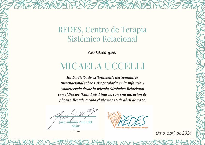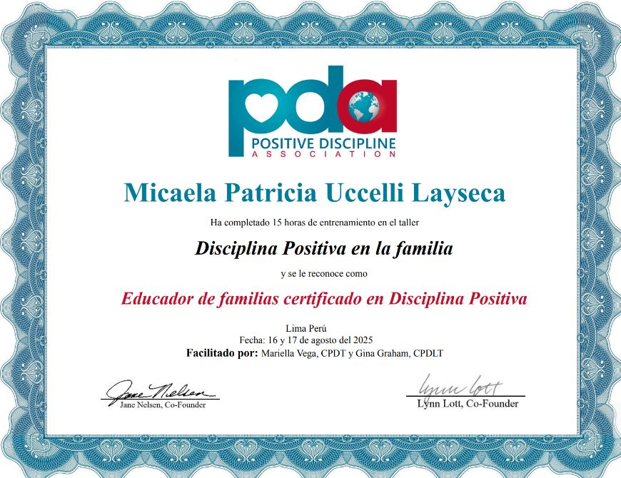 Cuento también con una especialización como educadora de familias en disciplina positiva y una diplomatura de especialización en Neuropsicopedagogía y Procesos Cognitivos. Comprender cómo funcionan los mecanismos biológicos, sociales y psicológicos, nos ayuda a plantear estrategias de soporte. Colegio de Psicólogos del Perú: 42477