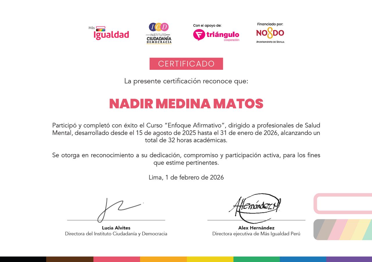 Agradezco profundamente el acompañamiento de Nadir. Desde la primera sesión me brindó un espacio de confianza y apertura. Es una excelente profesional, que ofrece herramientas efectivas para el crecimiento personal. Me siento muy contenta y satisfecha con cada una de las sesiones.