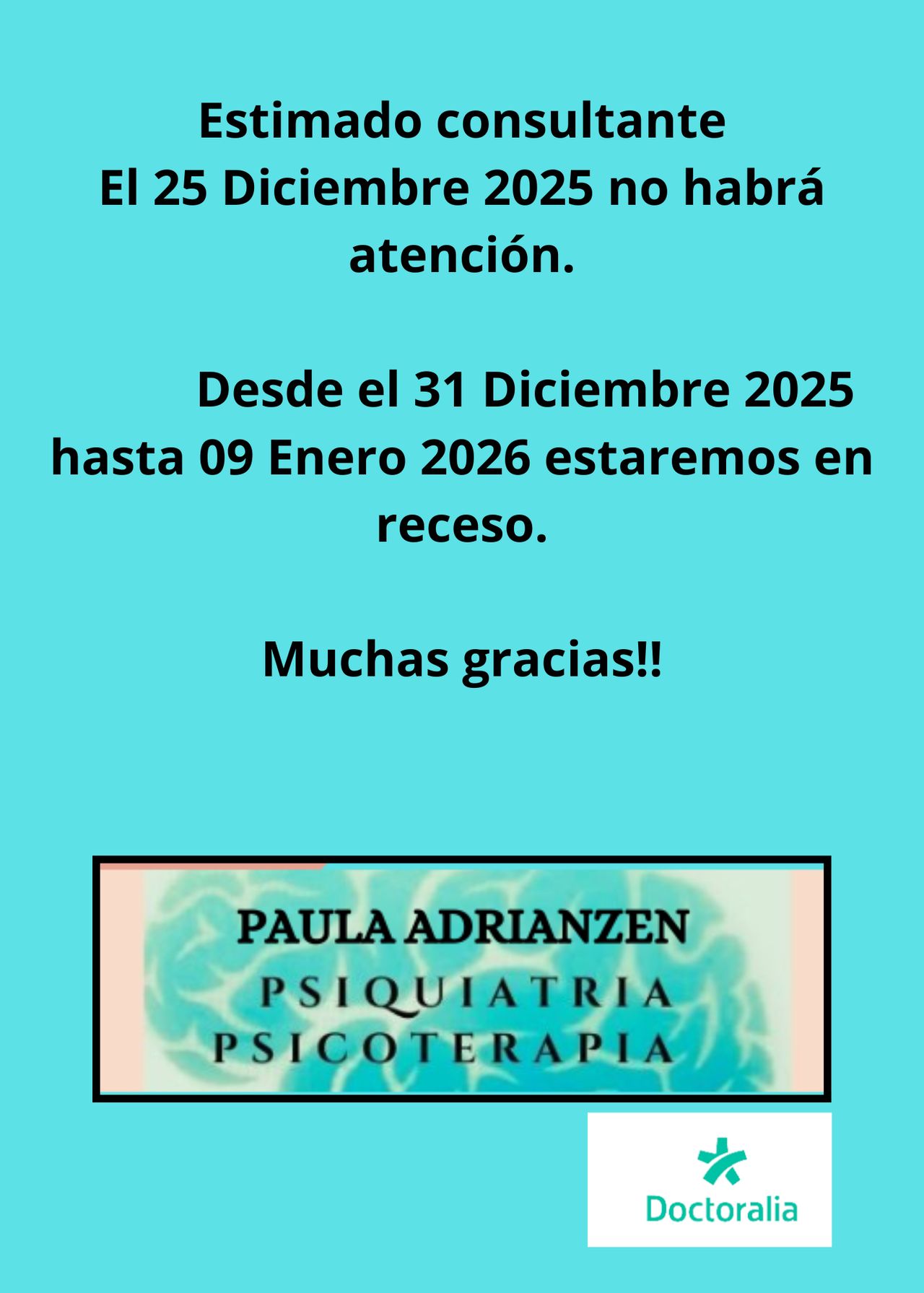 La Dra. Paula Adrianzen es una psiquiatra muy empática y profesional. Desde el inicio me escuchó con calma y respeto, dándome la confianza para hablar sobre mis dificultades de salud mental, incluyendo mi ansiedad, tristeza y problemas de concentración. Me explicó de manera clara el plan de tratamiento, los medicamentos y cómo pueden ayudarme, resolviendo mis dudas sin juzgarme. Me sentí acompañado en el proceso y con mayor claridad sobre mi salud mental. Recomiendo su atención a quienes necesiten un espacio seguro y claro para cuidar su bienestar emocional.