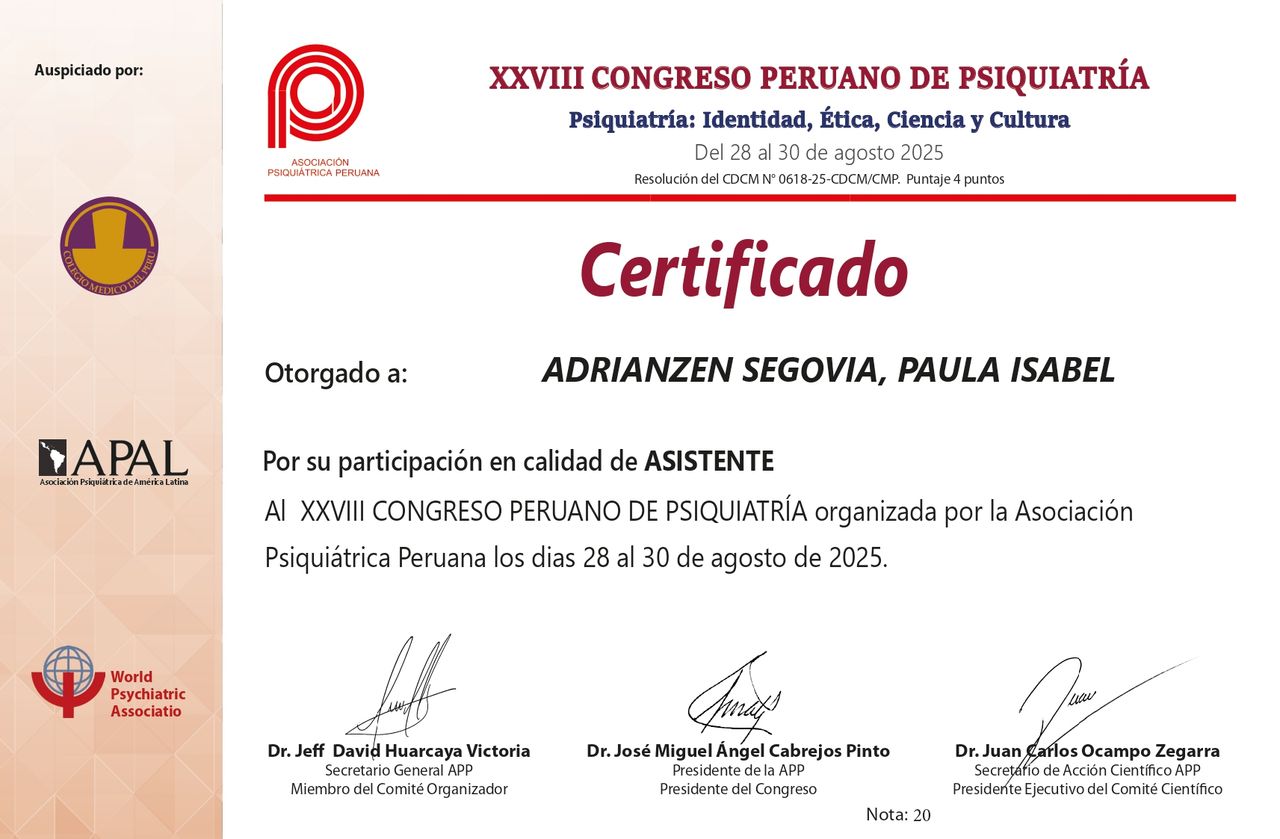 Muy buena atención que me da la Dra Adrianzen de manera detalla y personalizada con una comunicación fluida y acertada y tengo fé con ella para seguir sus indicaciones y consejos
