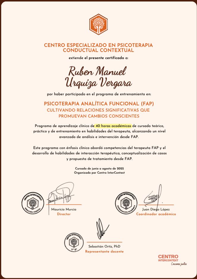 Ruben es psicólogo y psicoterapeuta colegiado (C.Ps.P. 38650) maestrante en Psicología de la Salud, formado en análisis de la conducta y en terapias contextuales de tercera generación como ACT (Terapia de Aceptación y Compromiso), FAP (Psicoterapia Analítica Funcional) y PBT (Process-Based Therapy). También cuenta con formación en terapia cognitivo-conductual, integrando sus herramientas prácticas dentro de un marco contextual y funcional, siempre orientado a la evidencia y a los resultados.